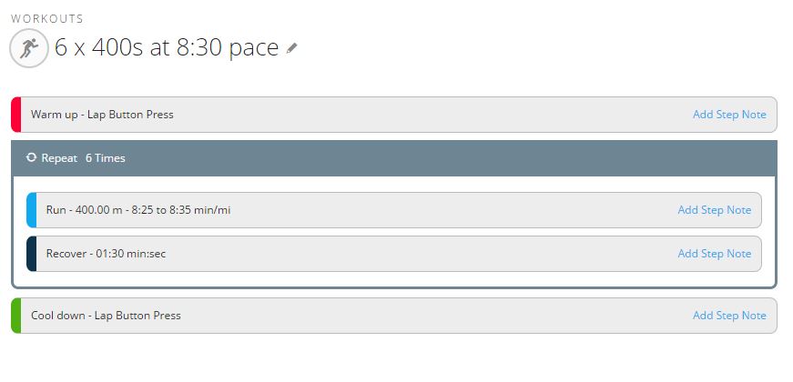 My New Garmin: The new Garmin is working out great! We picked the Forerunner 220 for me, because it has the ability to accept pre-programmed workouts. I got on the computer and entered in my workout on Garmin Connect, and then sent it to my watch. My watch then notified me each time I needed to start or stop a repeat, let me know whether I was in the desired pace zone, and counted down the seconds of each recovery interval. It takes all the timing work out of running repeats.