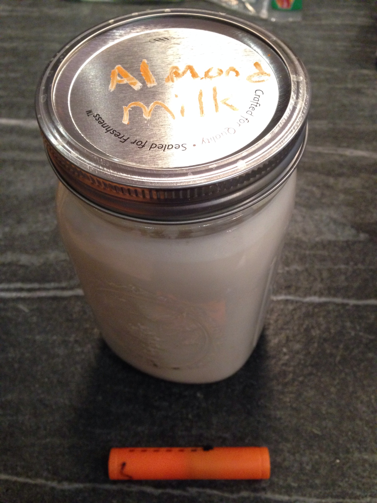I stored my home-made almond milk in a 32 oz canning jar and wrote on the lid with one of Will & Andrew’s bath crayons. They’re washable, so I can wipe the lid off and re-label it for future use.