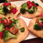 4. After 10-15 minutes of tofu-cooking, add the broccoli to the tofu pan. If you don’t love raw garlic, add the garlic here! Cook for another 5 minutes, or until broccoli is warm throughout. Add the carrot ribbons to the tofu right before you turn off the heat to give them a very mild cook.
