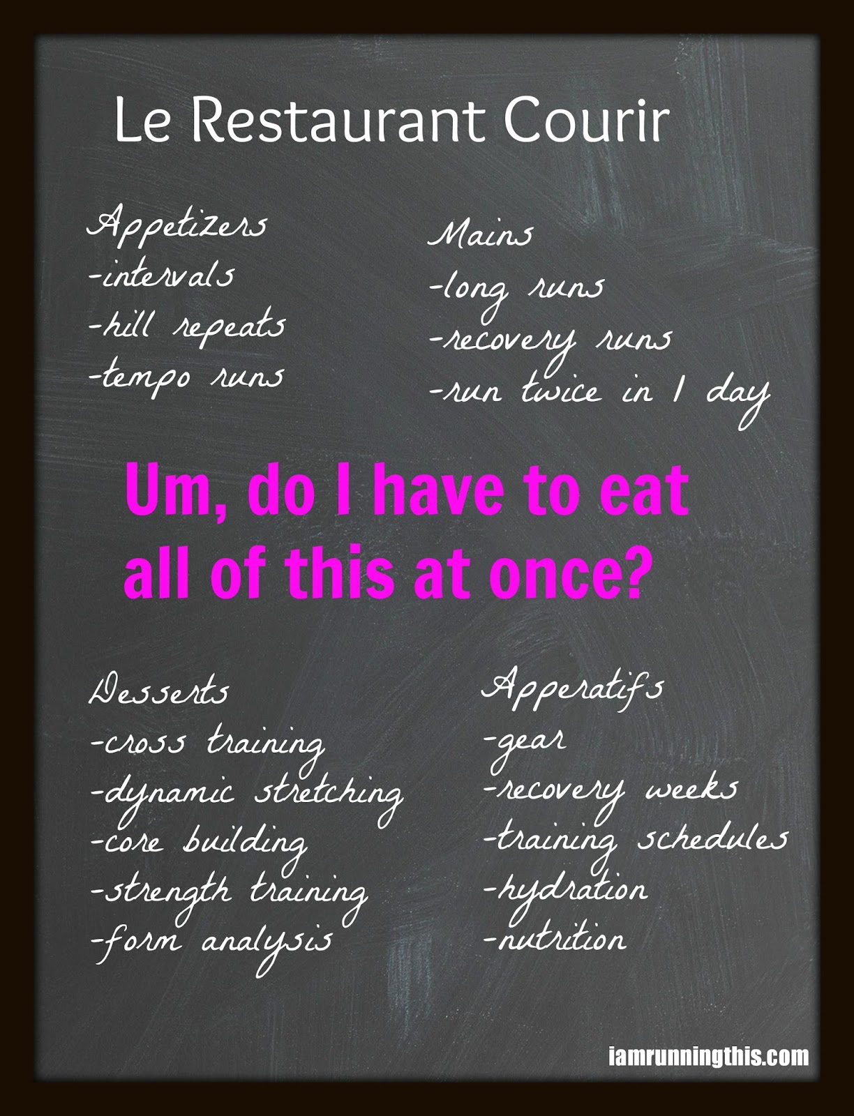 That’s when it hit me – I should not be stressing out over all of these things faster runners are doing to become fast. I should not be sitting down and building the perfect weekly workout with strength training and cross training and dynamic stretching and hill repeats. That’s too much, too soon. I shouldn’t look at all this information out there as a checklist of what I must do to become a better runner. I should look at it as a menu, for all the available options out there that could help me get faster, run longer, and stay injury free. And I should pick one menu item at a time to work on, and once it’s comfortably incorporated, maybe pick something else to add.