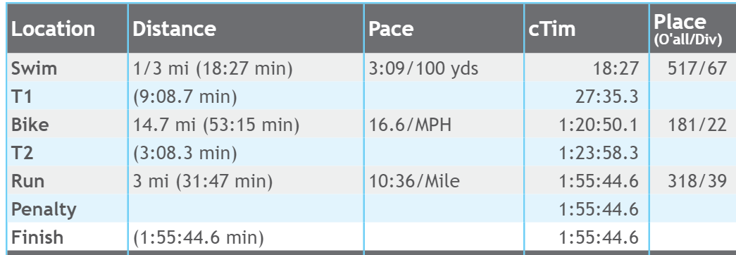 As expected, I was pretty slow on the swim. (The point was to make it, and I did!) What was unexpected was that I’m comparatively a better cyclist than I am a runner! My bike time was 181 overall, and my run time was 318 overall.